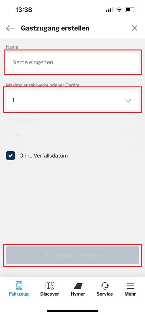 Importante: El acceso de invitado sólo puede ser escaneado por otra cuenta HYMER. Con los mismos datos de acceso que el usuario principal, sólo se puede escanear el código QR del propio vehículo. Si lo haces, también eres usuario principal.