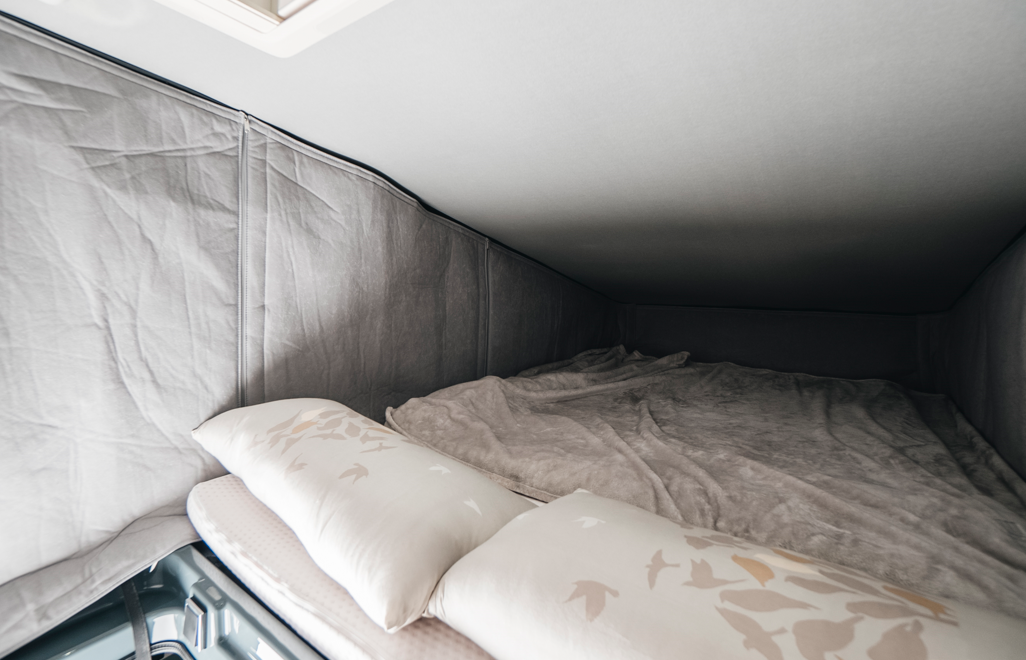 El techo elevable puede cerrarse con el aislamiento adjunto. Sin embargo, el techo no se puede asegurar, por lo que hay que quitar el aislamiento antes de viajar.