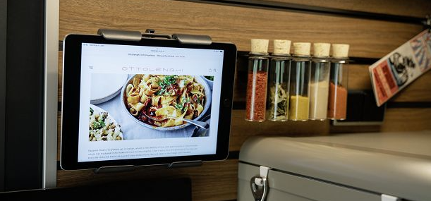 Tarjottimen pidikkeen ansiosta voit näyttää reseptejä ruoanlaiton aikana ja nauttia elokuvasta illalla.