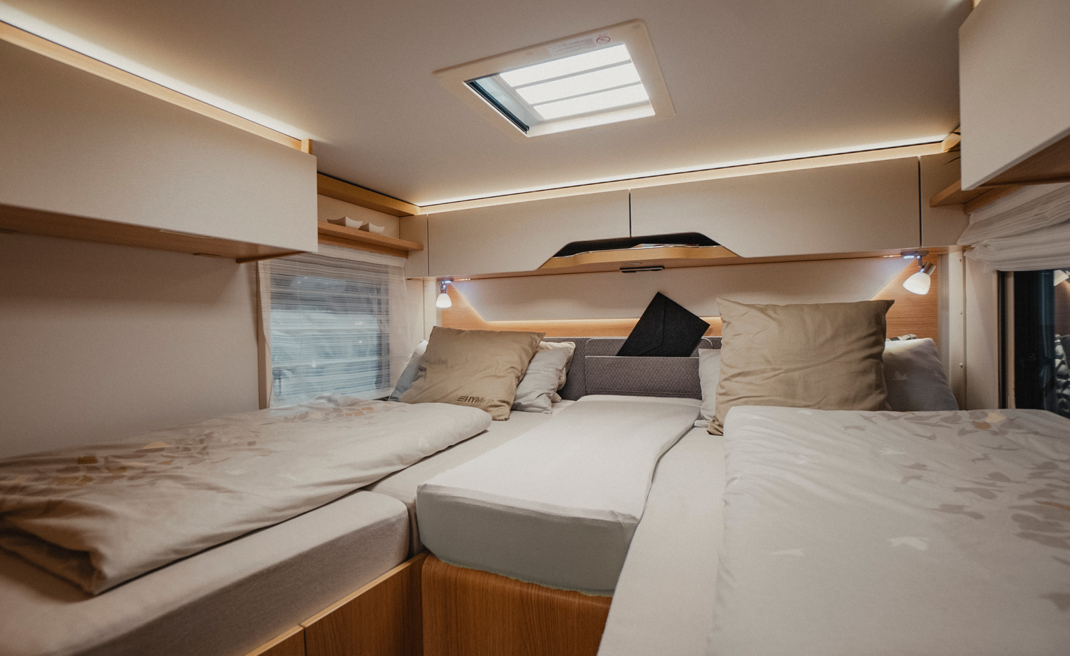 Con la prolunga per il letto singolo longitudinale degli accessori originali Hymer, è possibile ottenere una superficie di appoggio di circa 135-140 cm nel veicolo.